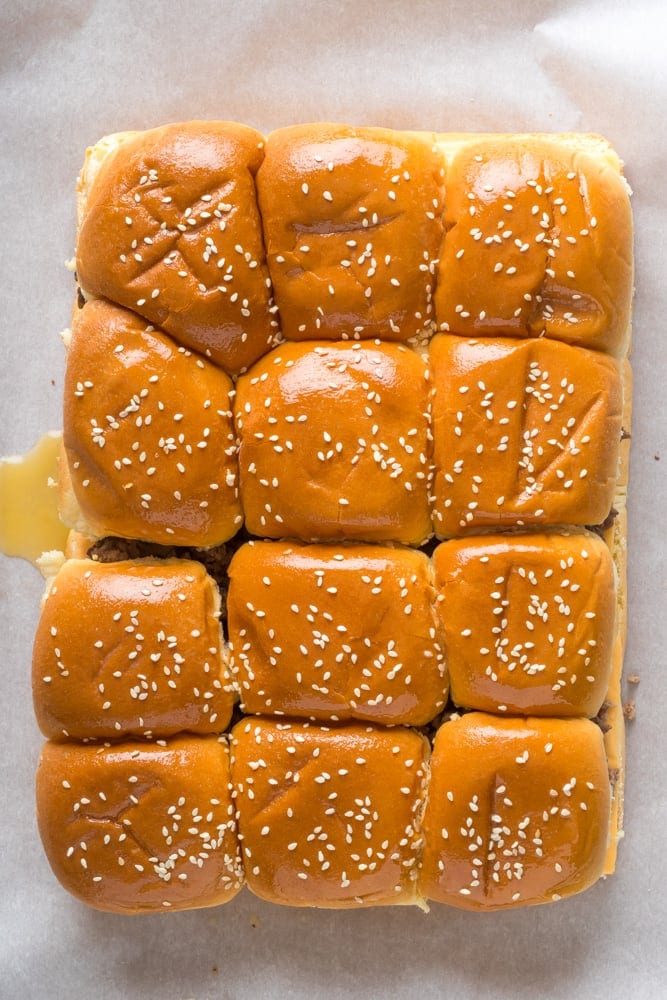 - Add the top half bun onto the sliders. Brush the top with the melted butter then sprinkle the sesame seeds on top. Place the sliders in the oven and bake for 10 minutes or until the buns have toasted.