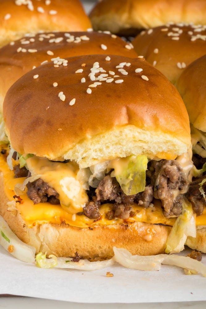 Big Mac sliders are a fun and homemade way to enjoy the classic burger. A fun-sized version featuring American cheese, pickles, onion and the special sauce in a buttery Hawaiian dinner roll topped with sesame seeds. Perfect for game day, grilling season, holidays or any day is perfect to enjoy these sliders!