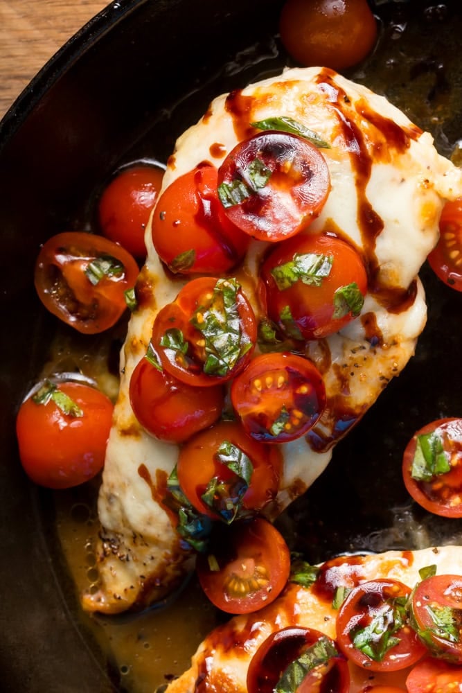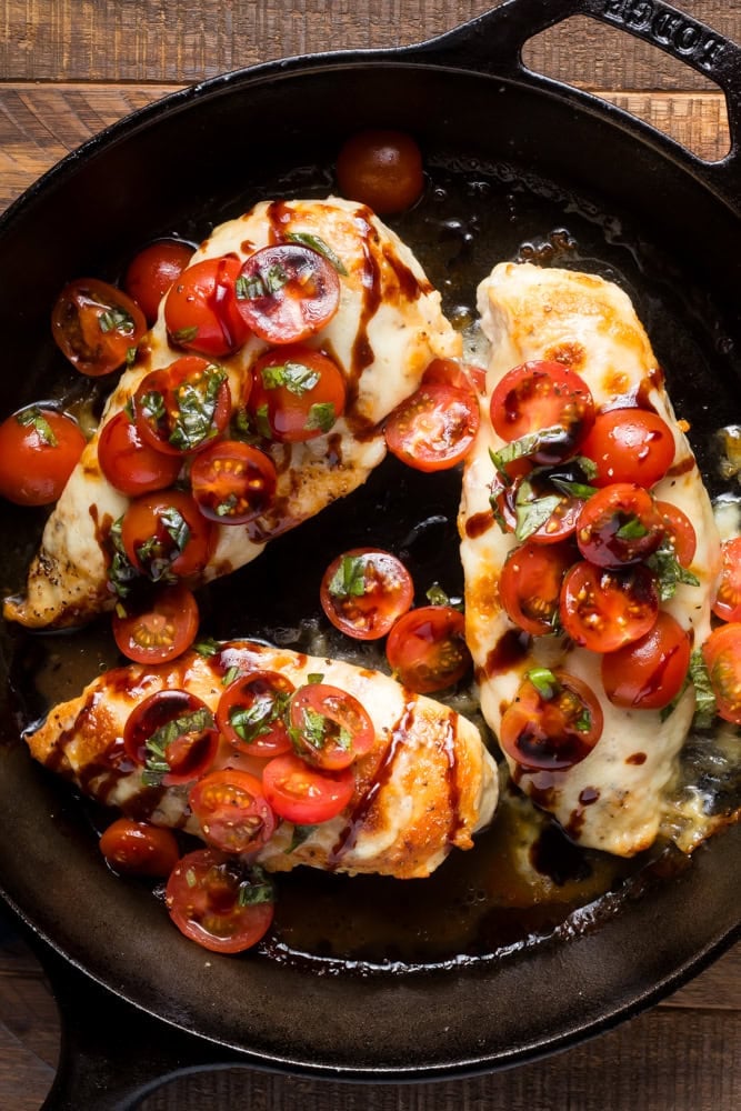 Bruschetta chicken made right in the skillet topped with mozzarella cheese, a mix of sweet tomatoes and finished with a sweet, tangy balsamic glaze.