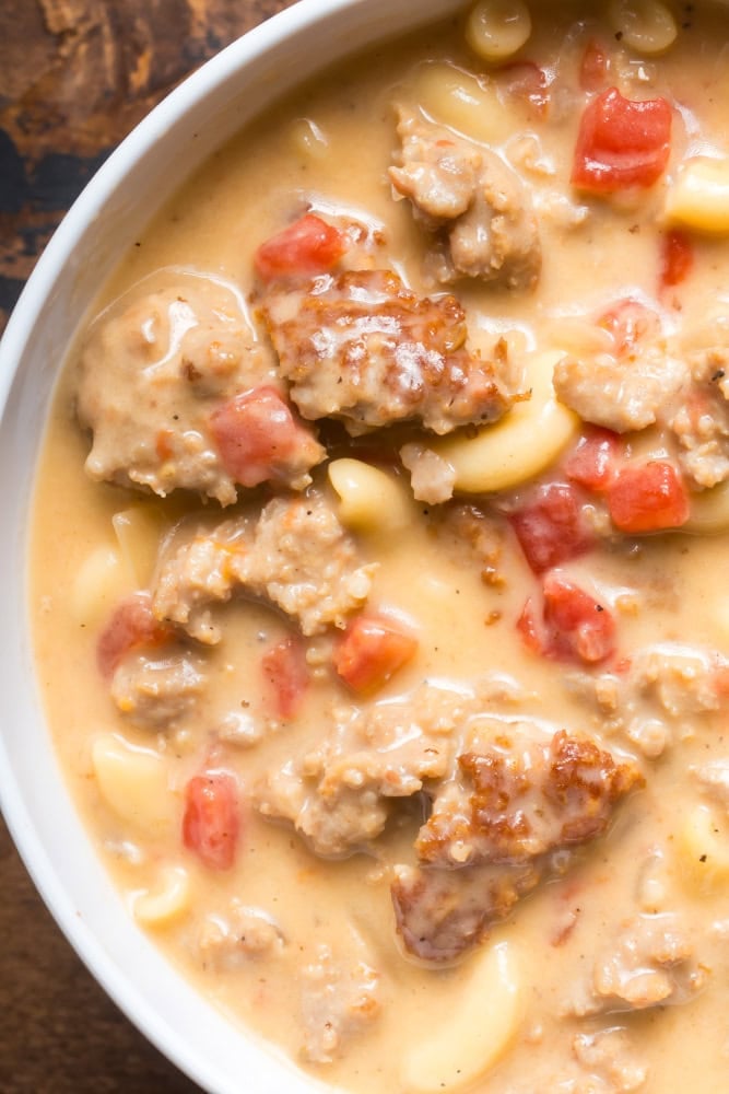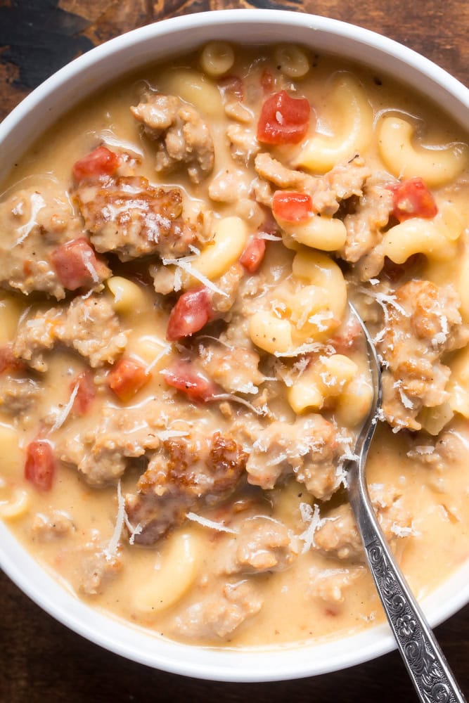 Creamy parmesan Italian sausage soup with macaroni in a creamy, cheesy broth that’s easily made and perfect for your next meal.
