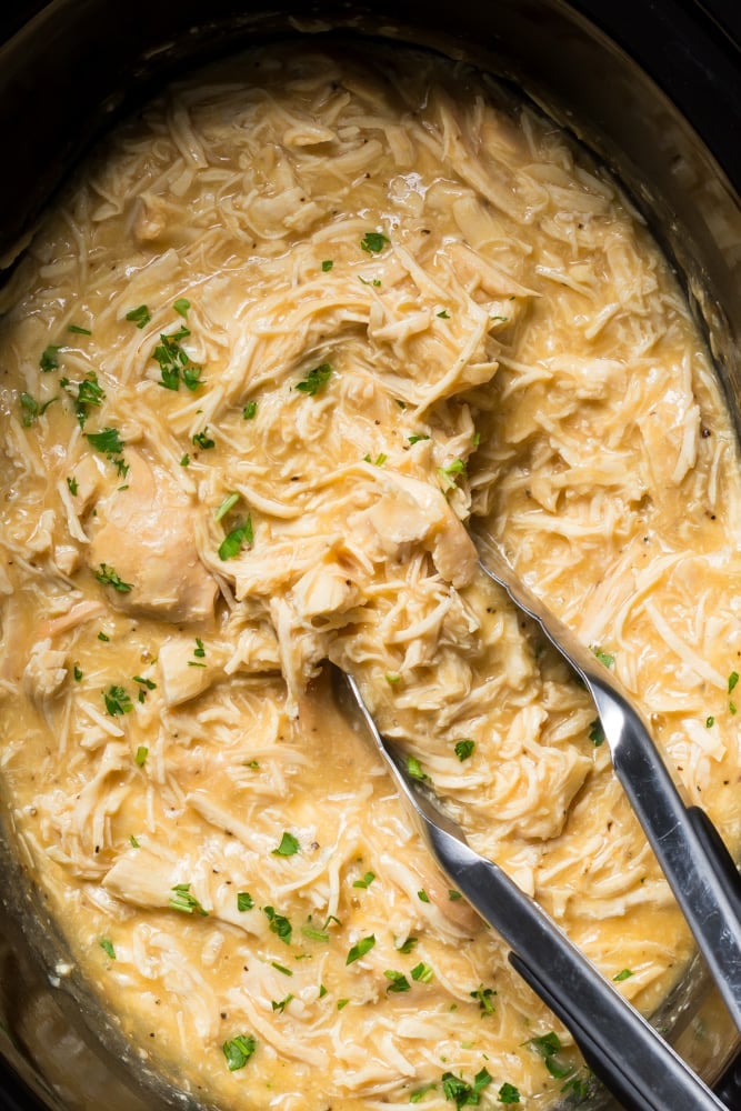 - Remove the chicken breast and shred the chicken. Now, add the chicken back into the crockpot with the gravy and serve.