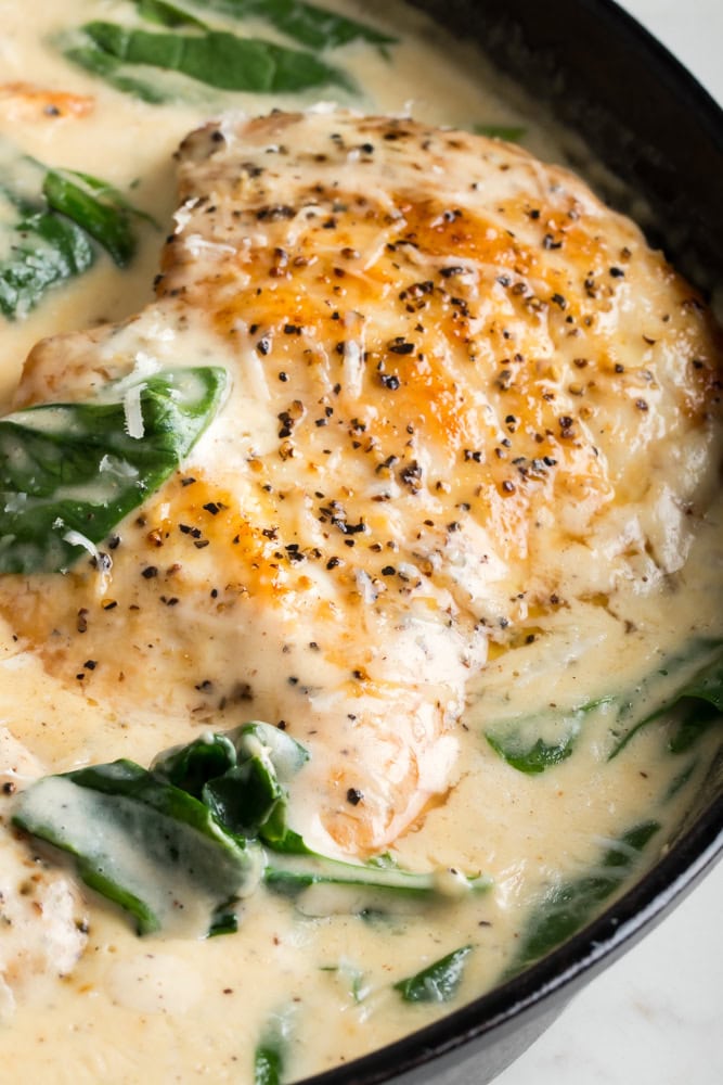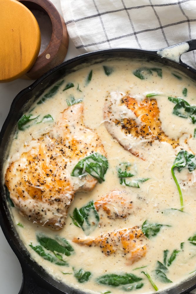 - Cut your own chicken cutlets. As mentioned above, thin breast can be used in the recipe. I don’t recommend it because it’s easy for them to overcook and come out dry. You also don’t want to use the huge chicken breast they sell. Slicing them in half will get you the perfect thickness to cook the garlic chicken and spinach recipe.