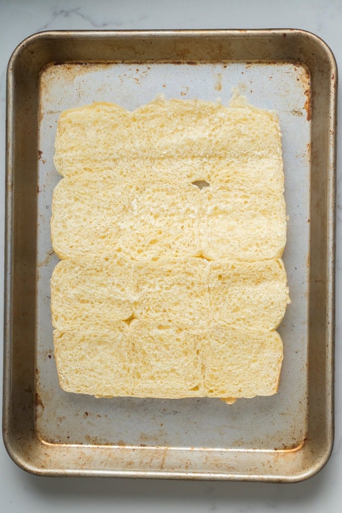 - Slice the dinner rolls in half to create a top and bottom half for the sliders. Do not separate the dinner rolls. Place the top half for the sliders to the side.