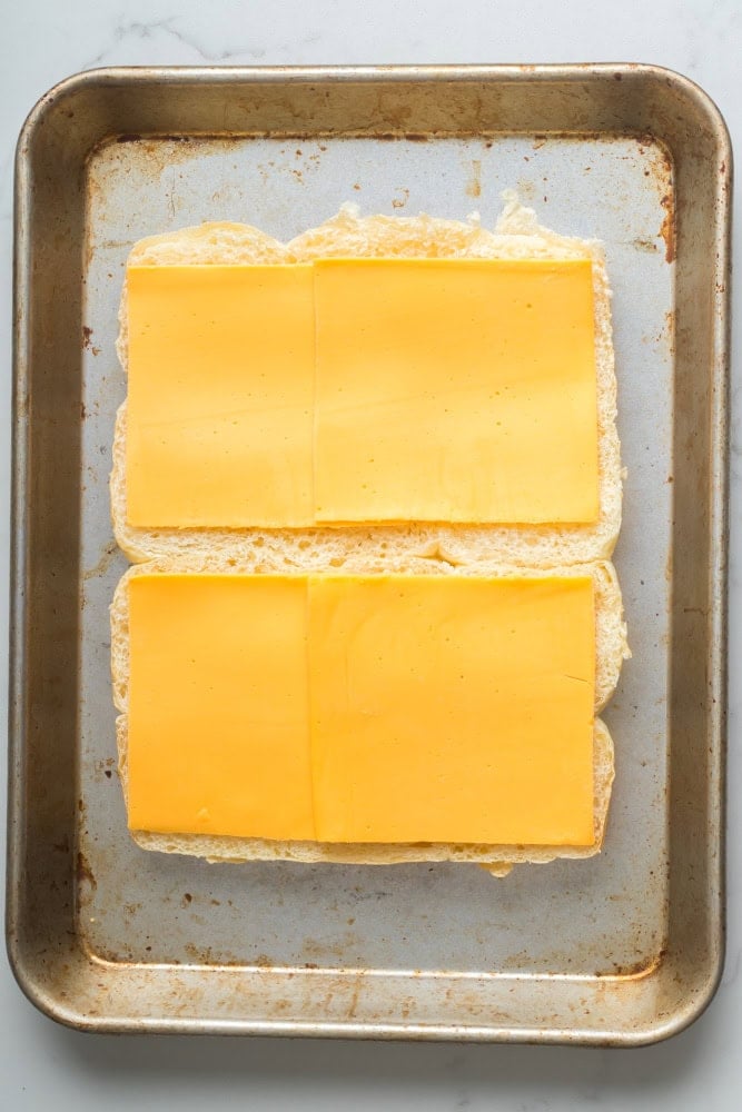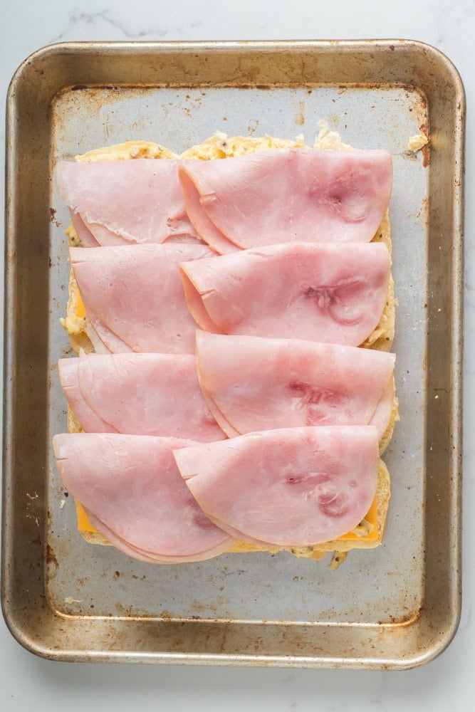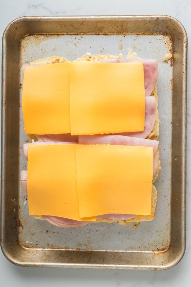 - Place the bottom half of the sliders on a sheet pan. Now, layer the sliders as so from the bottom: cheese, egg, ham, cheese. Now, place the top half of the sliders on top.