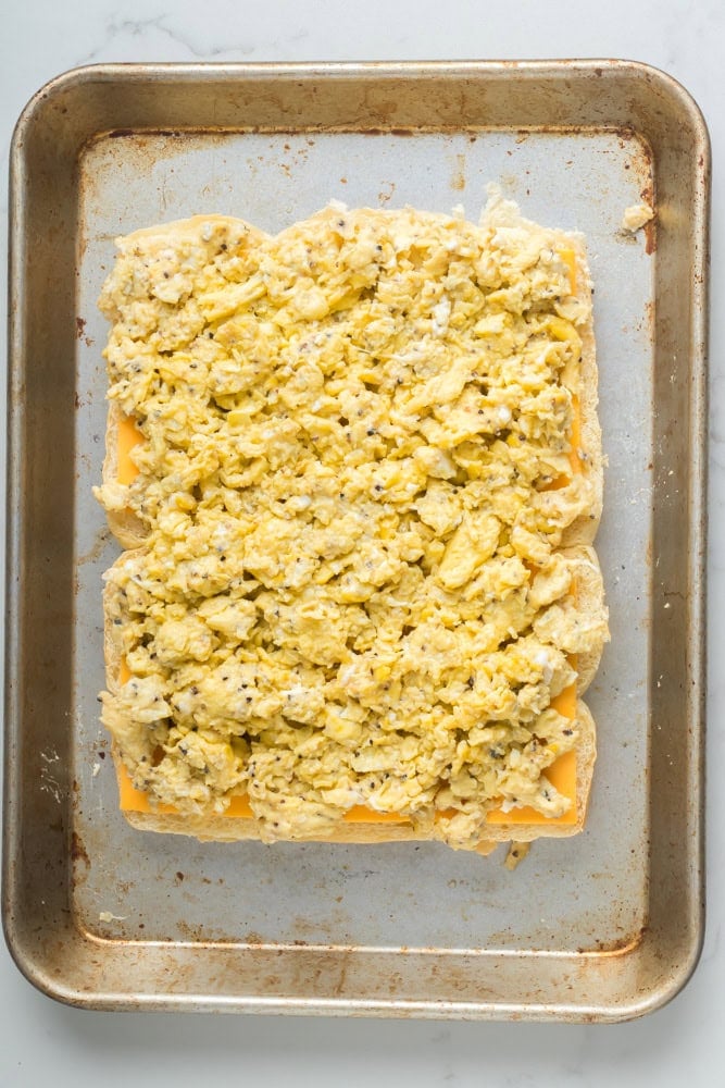 - Slice the dinner rolls in half. Then start by stacking the cheese first. Next, add the scrambled eggs.