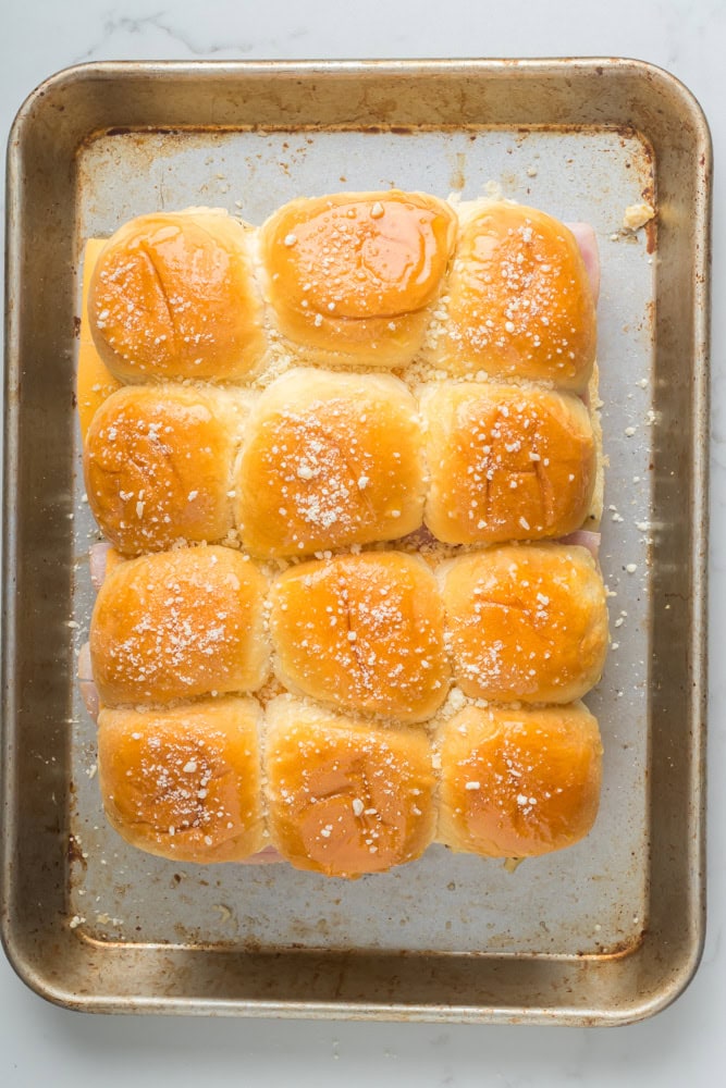- Brush the butter across the tops then sprinkle the parmesan cheese. Now, cover the sliders with aluminum foil. Place them in the oven and bake for 10 minutes. Then, carefully remove the foil then bake another 5-8 minutes to brown the tops of the sliders.