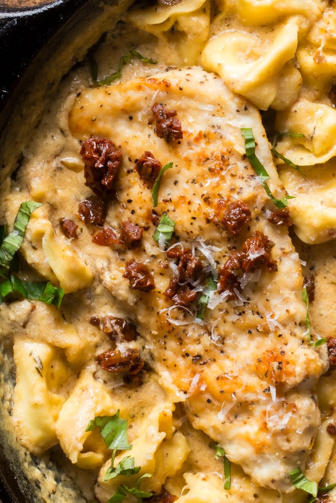 - Lastly, the sauce is finished. Chop up the chicken and add the tortellini into the pasta. Serve with basil, more sun dried tomatoes and a little of freshly grated parmesan cheese.