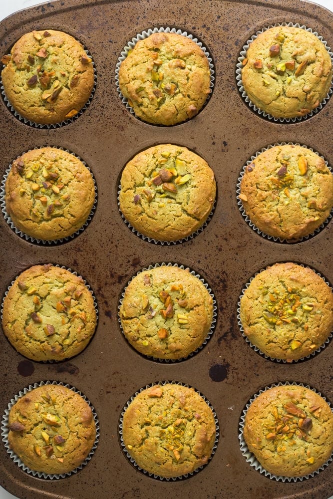 - Add the batter to a muffin pan, the recipe makes 12 muffins. Then, sprinkle a few pistachios on the top of each muffin.