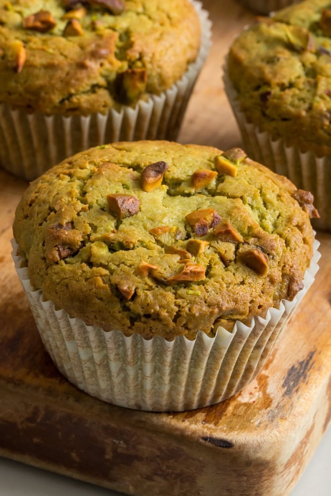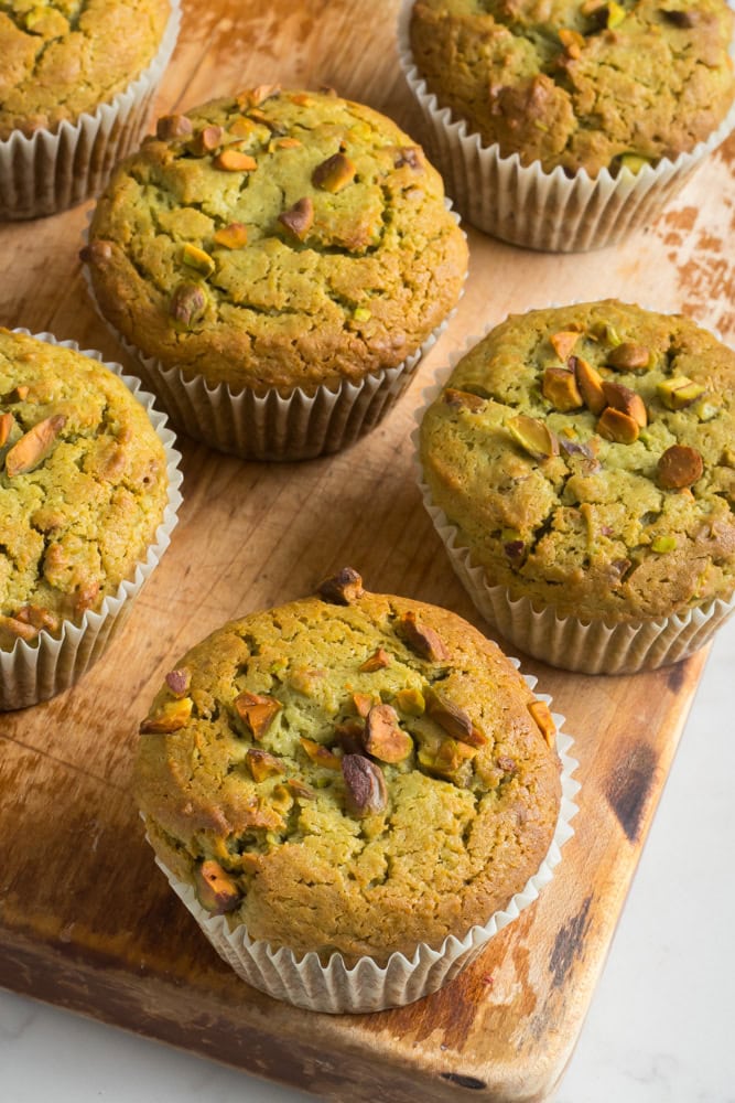 Storing these pistachio muffins are super easy. You can leave them on the counter in a sealed container for 2-3 days or store the in a container in the fridge for up to 5 days. Note, they will get hard in the fridge so leave them on the counter to come to room temperature or pop them in the microwave a few seconds.
