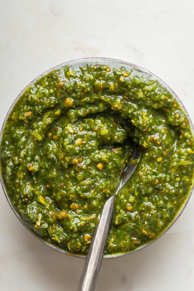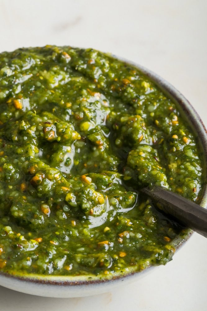 - How it taste: This pistachio pesto is delicious. All the notes shine from the nutty flavors of the pistachio and parmesan to the olive oil used. The basil is what gives the pesto it’s herby notes and a touch of lemon adds a bite of acidity to bring it all together.